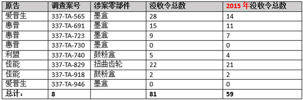 至今為止,USITC針對(duì)打印耗材行業(yè)頒布了以下8項(xiàng)主要GEO,下列數(shù)據(jù)簡(jiǎn)單地分析了USITC根據(jù)這8項(xiàng)GEO發(fā)布的沒(méi)收令總數(shù):