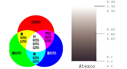 當(dāng)R、G、B三值互不相等時,混色為彩色。三原色按照不向的比例混合,在屏幕上可表現(xiàn)1670萬種可能的顏色。
