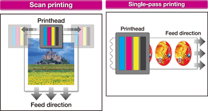 有兩種類型的噴墨打印系統(tǒng):掃描打印和單向打印。在掃描打印中,打印頭架在副掃描方向(打印介質(zhì)的橫向)往復(fù)運動,進(jìn)行多次循環(huán)以完成圖像打印處理。在單向打印中,打印頭架保持在固定位置,在印刷材料在下面?zhèn)魉偷耐瑫r,一次循環(huán)完成圖像打印。單向系統(tǒng)因其高速打印能力,已在要求高生產(chǎn)率的產(chǎn)業(yè)印刷領(lǐng)域投入使用。