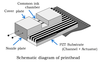 由壓電材料構(gòu)成的微型通道在電荷的作用下收縮。通道收縮時,通道所含油墨從噴嘴擠出,形成墨滴。通道恢復(fù)到原始狀態(tài)時,毛細(xì)作用導(dǎo)致油墨流回通道,以準(zhǔn)備產(chǎn)生下一個墨滴。