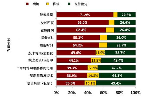 至少70%的受訪者希望四種需求情況趨勢(shì)增加或維持,這證實(shí)了打印生意現(xiàn)在被服務(wù)消費(fèi)者所取代。這種期盼致使他們適應(yīng)了數(shù)碼產(chǎn)業(yè)——包括生產(chǎn)系統(tǒng)、流水線、人工智能及云端打印技術(shù)等。