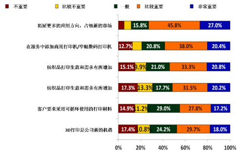 第二點(diǎn)非常有趣,超過(guò)半數(shù)的受訪者正在尋找“商業(yè)化/窄幅/小型”打印生意,將其作為拓展業(yè)務(wù)的策略。另外,紡織品打印也是打印商值得發(fā)展的重要方向。