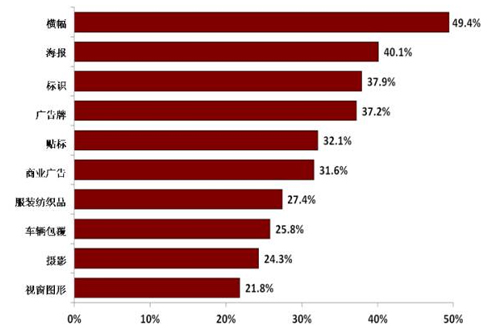 受訪者選出的近期排行較前的應(yīng)用中(圖6),橫幅(49%)、海報(bào)(40%)、標(biāo)識(shí)(38%)及廣告牌(37%)仍然是排名中前四的產(chǎn)品,但是,他們的發(fā)展方向卻是不同的。