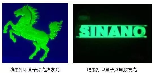 中科院蘇州納米所的印刷電子技術(shù)研究中心是國內(nèi)較早發(fā)展印刷電子技術(shù)的科研團隊。中心最近在量子點墨水的調(diào)配及打印成膜質(zhì)量上取得了較大的突破。自行研發(fā)的量子點墨水具有非常好的穩(wěn)定性,墨水放置一個月后仍然穩(wěn)定并且保持與商業(yè)量子點相同的發(fā)光效率。采用噴墨打印制備的量子點薄膜達到了相當于旋涂方式制備薄膜的水平, 粗糙度低于2.2nm。已成功實現(xiàn)噴墨打印量子點電致發(fā)光,在低于9V的電壓驅(qū)動下,發(fā)光亮度超過4000cd/m2。噴墨打印的優(yōu)勢是可以方便的制備發(fā)光圖案,下圖展示的是噴墨打印量子點形成的光致與電致發(fā)光圖形。初步實驗表明,采用噴墨打印技術(shù)制備量子點器件是可行的,下一步的目標是實現(xiàn)印刷量子點的顯示器件。