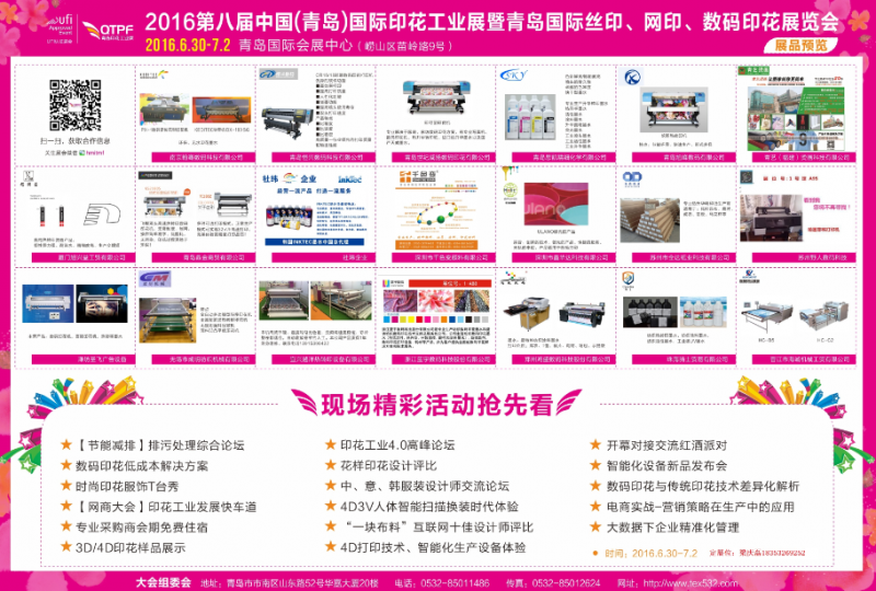 ※2016青島國際印花工業(yè)展【2016.6.30-7.2日】將致力邀請專業(yè)印花產(chǎn)業(yè)上下游企業(yè)參與,同時(shí)涉及紡織品上下游企業(yè)、工藝品企業(yè)、印花印染廠、廣告等行業(yè)企業(yè)一同出席。除此之外,各省市印花行業(yè)協(xié)會(huì)領(lǐng)導(dǎo)特邀支持,百余場行業(yè)論壇、活動(dòng)相繼推出,恭迎行業(yè)人士前來參觀。