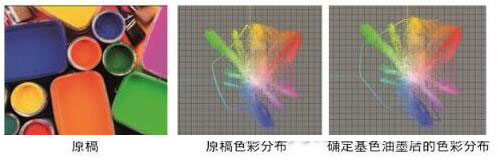 圖1 原稿及其色彩分布圖以及確定基色后的色彩分布