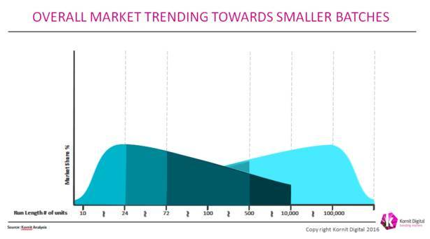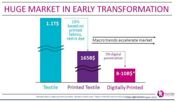 第一個(gè)改變是傳統(tǒng)印花(手工印花、絲網(wǎng)印花、染色印花)向數(shù)碼印花的轉(zhuǎn)變。據(jù) Kornit Digital 2016年的數(shù)據(jù)顯示,紡織行業(yè)總產(chǎn)值 1.1萬(wàn)億美元,其中印花紡織品占比 15%產(chǎn)值1650億美元,其余為染色紡織品;而在印花紡織品當(dāng)中,數(shù)碼印花的產(chǎn)值目前是 80~100億美元,占比 5%,未來(lái)具有強(qiáng)大的增長(zhǎng)空間。