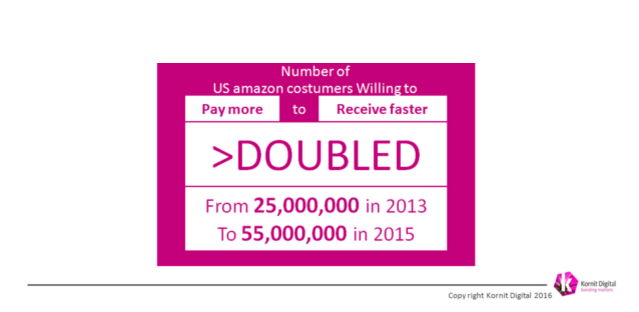 其次,他們更傾向于及時(shí)消費(fèi),電商巨頭亞馬遜的數(shù)據(jù)為例:2013年~2015年間,在亞馬遜網(wǎng)站愿意支付額外費(fèi)用享受“快速到貨”服務(wù)的消費(fèi)者從 2500萬(wàn)人增加到 5500萬(wàn)人,增長(zhǎng)超過(guò)一倍。