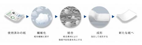 干式造紙的過程可以總結(jié)為:“廢紙-纖維化-粘合-成型-再生紙”。通過機(jī)械處理,廢紙被轉(zhuǎn)化為棉花狀的細(xì)長纖維,隨后根據(jù)紙張用途,PaperLab使用不同粘合劑將纖維結(jié)合在一起,壓緊成型。從投入廢紙到生產(chǎn)出再生紙,整個(gè)造紙過程只需要3分鐘。在造紙過程中僅需添加少量水,以保持機(jī)器內(nèi)的環(huán)境濕度。