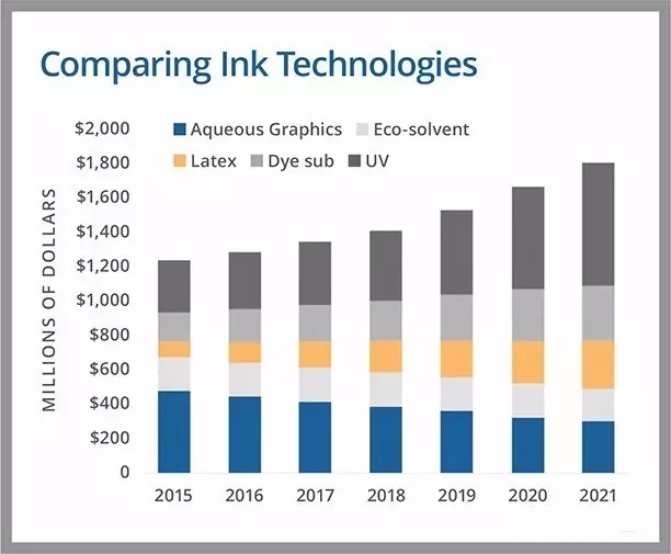 另一方面,Latex在某些情況下取代了生態(tài)溶劑和其他生產(chǎn)技術(shù),但也是根據(jù)其可實(shí)現(xiàn)的質(zhì)量,基材的多變性和生態(tài)友好性來(lái)尋找新的市場(chǎng)。Latex油墨在北美的價(jià)值為1.5億美元,IDC預(yù)計(jì)從2016年到2021年,其年均復(fù)合增長(zhǎng)率為18%。從收入的角度來(lái)看,至少在北美,Latex墨水相對(duì)不受第三方墨水供應(yīng)商的影響, 而在生態(tài)溶劑領(lǐng)域,有大型公司涉及第三方墨水。到2019年,Latex墨水預(yù)計(jì)收入預(yù)計(jì)將超過(guò)生態(tài)溶劑型噴墨墨水的收入。