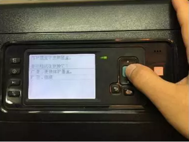 一、當(dāng)我們?cè)谑褂眠^程中,機(jī)器忽然停止工作,前面板顯示需要更換維護(hù)墨盒時(shí),我們需要按照機(jī)器提示點(diǎn)擊更換維護(hù)墨盒。