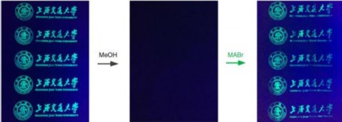 基于這種想法,張從陽在后續(xù)實驗中直接把MOFs用來作為記錄機(jī)密信息的載體,通過打印的方式印在紙上,噴上鹵鹽就可以迅速地產(chǎn)生熒光鈣鈦礦納米晶,印有信息的地方就產(chǎn)生熒光,信息就被讀出來,也就是完成了解密過程。