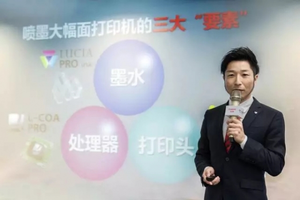 佳能(中國)專業(yè)打印產(chǎn)品事業(yè)部寬幅面打印市場部經(jīng)理佐藤貴志介紹新品核心優(yōu)勢