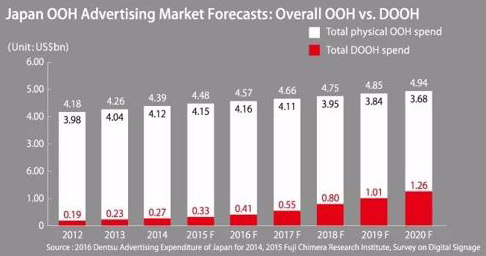 根據(jù)上圖預(yù)測(cè),今年日本整體戶外廣告市場(chǎng)收入將達(dá)46.6億美金,其中傳統(tǒng)廣告收入41.1億美金,數(shù)字戶外收入5.5億美金。 根據(jù)PeterJ.Solomon公司2016年的調(diào)查,2013–20年,全球數(shù)字戶外廣告市場(chǎng)預(yù)計(jì)將實(shí)現(xiàn)13.2%的年度復(fù)合增長(zhǎng)率,而根據(jù)富士總研社2015年的數(shù)字標(biāo)牌研究報(bào)告,在日本,這一數(shù)字將為27.8%,展示出強(qiáng)大的增長(zhǎng)能力。此外,海洋戶外2016年的研究報(bào)告將日本數(shù)字戶外從現(xiàn)在到2021年的增長(zhǎng)率預(yù)估為86%,超過了移動(dòng)(67%)和在線廣告(49%)的增幅。 根據(jù)富士總研社的研究報(bào)告,如下圖,2020年,數(shù)字戶外廣告市場(chǎng)價(jià)值預(yù)計(jì)將達(dá)1500億日元,復(fù)合年度增長(zhǎng)率為27.8%。