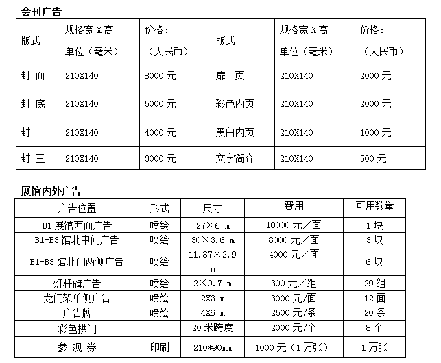 1、國際標準展臺(9 M²):國內企業(yè)5000元/個,國外企業(yè) $900/個(角位展臺加收10%);(含中英文楣板、三面圍板、一張洽談桌、兩把椅子、兩盞射燈、一個220V/2A電源插座、紀念品、客戶登記本、簽字筆、會場保安、會場清潔等);