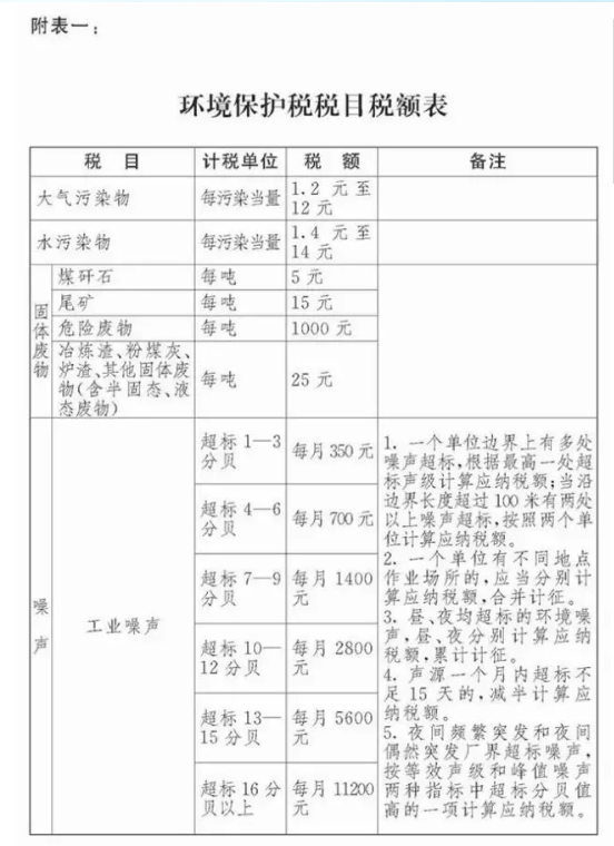 同時,本次環(huán)保稅法列出了環(huán)保稅征稅目的及稅額,強調(diào)了大氣和水污染物的稅額由省級政府確定,報經(jīng)省級人大常委會決定。具體參考如下: