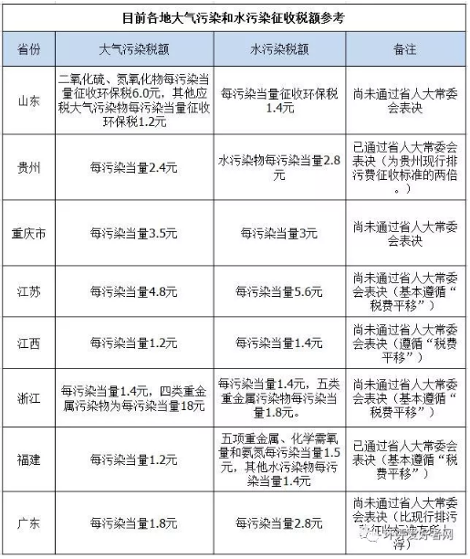 浙江:大氣污染物每污染當量1.4元,四類重金屬污染物為每污染當量18元;水污染物每污染當量1.4元,五類重金屬污染物每污染當量1.8元。基本遵循“稅費平移”。(尚未通過省人大表決)