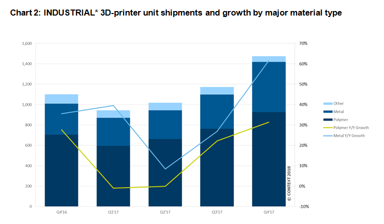 全球3D打印機市場在2017年第四季度繼續(xù)保持上升趨勢,本季度出貨量超過13.2萬臺,比去年同期增長14%。INDUSTRIAL * 3D打印機的出貨量增長了39%,主要得益于聚合物領域的新客戶,包括惠普和碳。但是,金屬3D打印機的出貨量繼續(xù)保持強勁,這些新打印機和GE Additive,EOS和SLM Solutions等行業(yè)巨頭也參與其中。