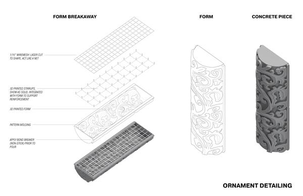 3D打印的塑料模具鑲嵌有激光切割絲網(wǎng)以提供增強。最終的原型是由VoxelJet使用VoxelJet VX1000 3D打印機(jī)制造的,用于鑄造模具,并用西卡混凝土在室內(nèi)制造。