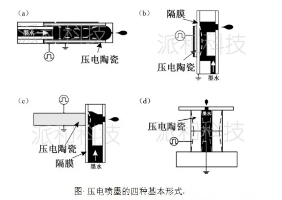 壓電噴墨技術(shù)原理:利用逆壓電效應(yīng),對壓電陶瓷致動器施加電壓引起陶瓷機(jī)械形變,形變在墨水腔中會產(chǎn)生的壓力或聲波,致使墨水在噴嘴處獲得能量斷裂,并以一定速度噴射出墨滴。根據(jù)壓電陶瓷變形模式的不同,壓電噴墨可分為四類:擠壓模式、彎曲模式、推動模式和剪切模式。