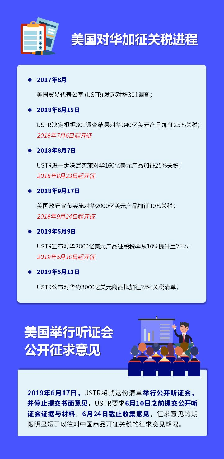 2019年5月13日,美國貿(mào)易代表辦公室(USTR)公布對約3250億美元中國商品擬加征25%關(guān)稅清單(簡稱清單4),涉及我國紡織行業(yè)對美出口比重較大的服裝(HS61、62章)和大部分家用紡織品(HS63、94章)以及部分紡織機械產(chǎn)品(HS84章),涉及我行業(yè)對美年出口金額超過400億美元產(chǎn)品。目前美國正在就該清單征求公眾意見,并將于6月17日舉行公開聽證會。對于是否正式針對該3000億美元中國商品清單加征25%關(guān)稅,還將在公開聽證會征求意見后,結(jié)合中美貿(mào)易談判的最新進(jìn)展情況而定。