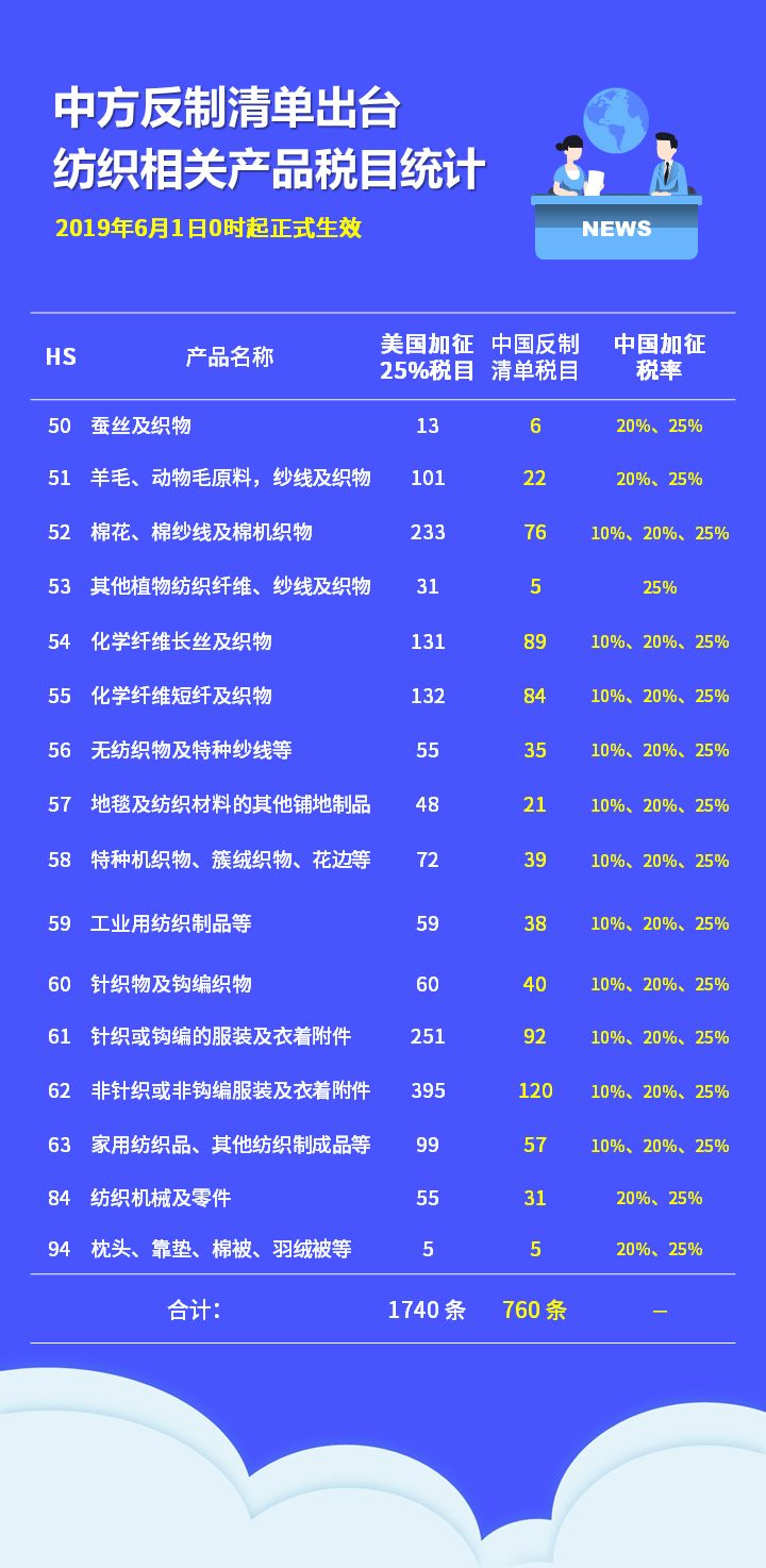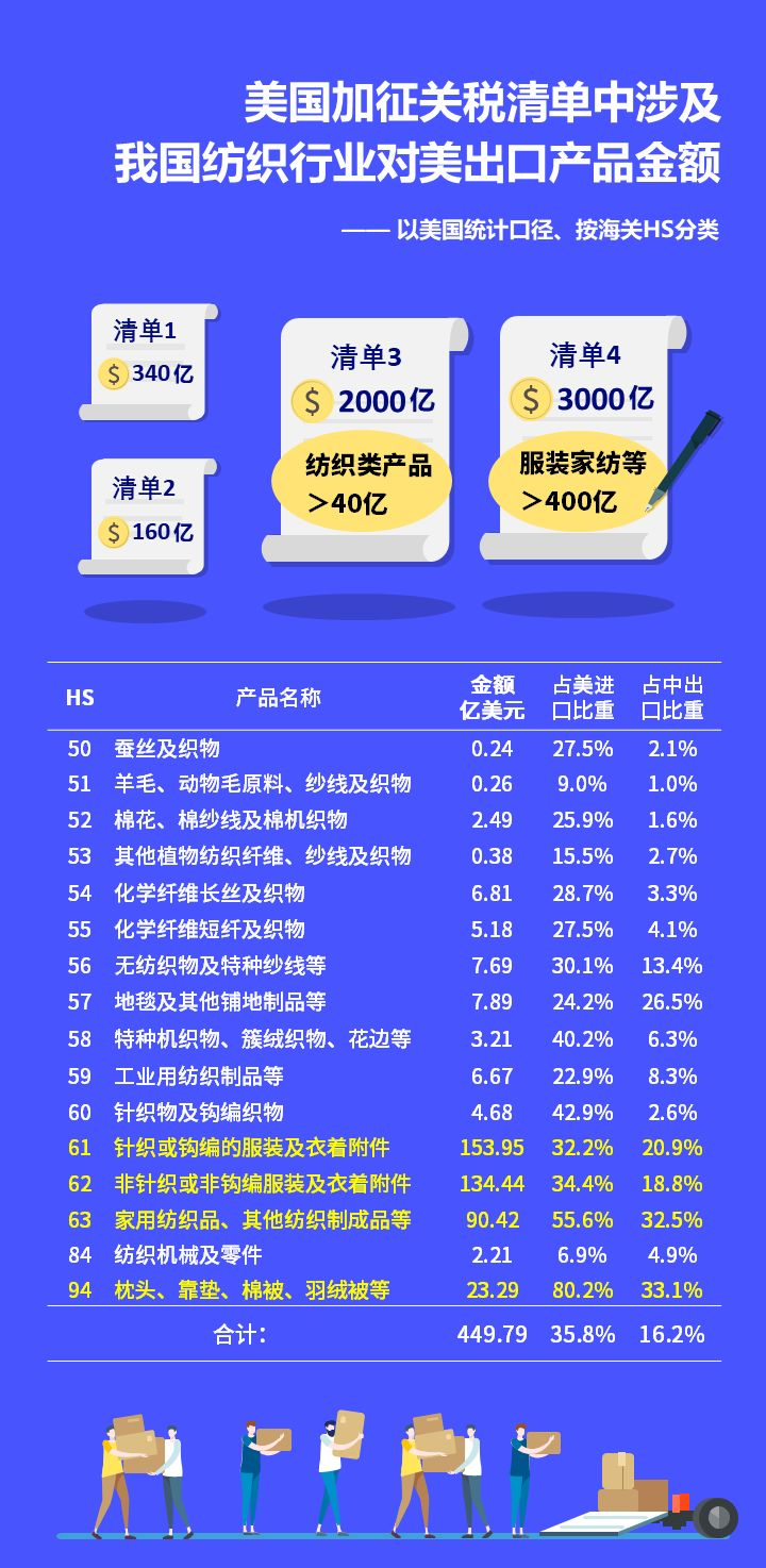 此前5月9日,美國政府宣布自2019年5月10日起,對從中國進(jìn)口的2000億美元清單商品(簡稱清單3)加征的關(guān)稅稅率由10%提高到25%,其中已經(jīng)包括了幾乎全部種類的紡織紗線、織物、針織、產(chǎn)業(yè)用制成品及部分家用紡織品和紡織機械產(chǎn)品,這些產(chǎn)品對美年出口額逾40億美元,至此兩份清單以互補的形式幾乎覆蓋了我行業(yè)全部對美出口的紡織服裝產(chǎn)品,總額約450億美元。