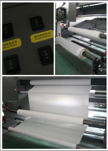 一般的打印機(jī)只有前置烘干,烘干的速度跟不上打印的速度,收卷起來可能就會黏住,但是泰拓的這臺8頭機(jī)配備前置烘干和底烘干,雙重烘干使得打印紙張?jiān)谑站砥饋碇熬蛷氐赘稍?,不會影響后續(xù)的熱轉(zhuǎn)印。