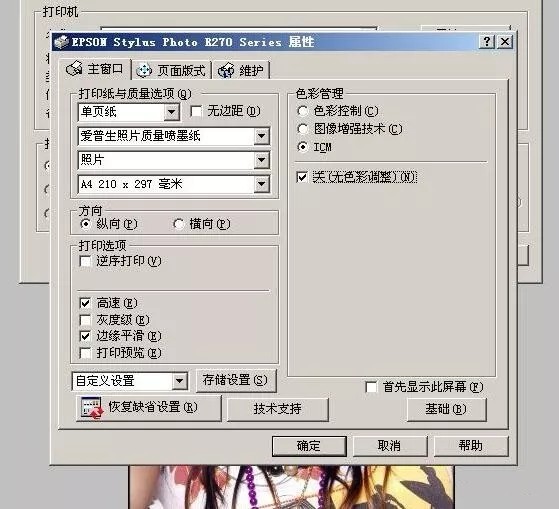 質(zhì)量選項(xiàng)和打印紙張選項(xiàng)中的類型選項(xiàng),是根據(jù)定制ICC時(shí)的設(shè)定來選擇的,如果在定制ICC時(shí),所用的設(shè)置為:照片/照片質(zhì)量噴墨紙,則此時(shí)就選擇:照片/照片質(zhì)量噴墨紙。所以在收到ICC文件時(shí)也要了解此ICC打印設(shè)置。