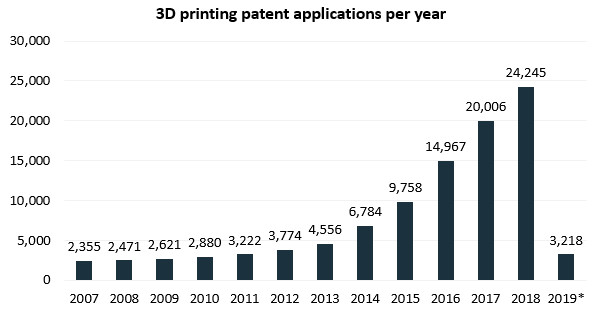 從IPlytics公布的數(shù)據(jù)可以看出,2007年以來,全球3D打印相關(guān)專利申請數(shù)量逐年保持增長,2018年達(dá)24,245項。