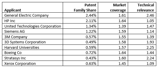 技術(shù)相關(guān)性指標(biāo)是指專利被引用的數(shù)量,高技術(shù)相關(guān)性值可被認(rèn)為是特定細(xì)分市場中的領(lǐng)先技術(shù)。如表1所示,前10名專利所有者的3D打印專利組合具有高技術(shù)相關(guān)性(數(shù)值高于1,代表高于平均值)。在前10名專利申請者中,GE、Stratasys和哈佛大學(xué)的技術(shù)相關(guān)性得分最高。