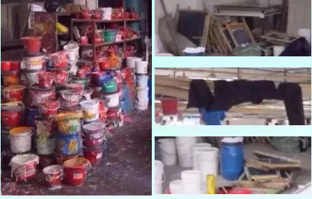 另外,現(xiàn)場(chǎng)還存在較大的消防隱患:各種染、顏料無(wú)序堆放,地面也有大片已經(jīng)風(fēng)干的殘余染料,生產(chǎn)線上存有大量易燃物品——紡織品和木框,卻未見(jiàn)配備消防器材。