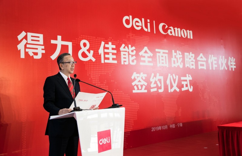 得力集團有限公司總裁婁甫安先生與佳能(中國)有限公司董事長兼首席執(zhí)行官小澤秀樹先生出席儀式,并代表雙方簽訂全面戰(zhàn)略合作伙伴的宣言。