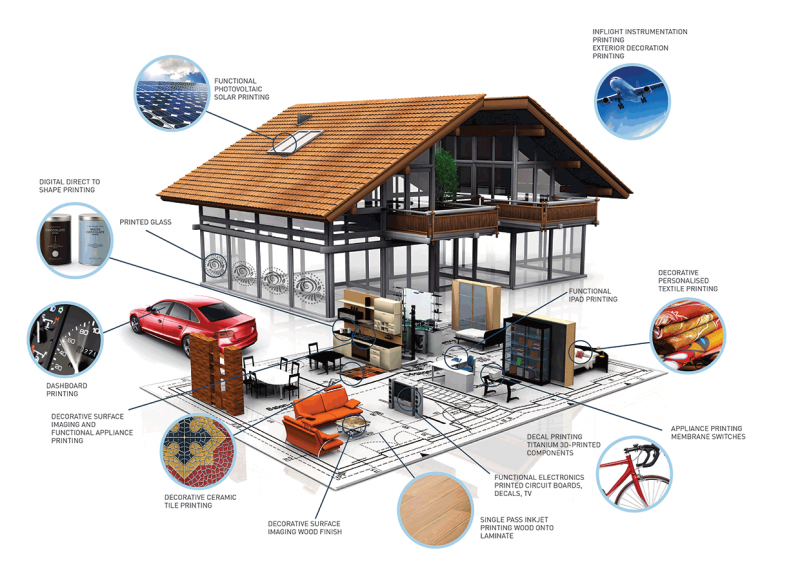 工業(yè)應(yīng)用范圍很廣:從使電子產(chǎn)品或設(shè)備實(shí)現(xiàn)功能印刷,個(gè)性化設(shè)計(jì)的批量產(chǎn)品和包裝,到在玻璃,金屬或木材等各種表面上進(jìn)行裝飾性印刷。工業(yè)設(shè)計(jì)師使用3D打印等特殊技術(shù)進(jìn)行原型制作,或?yàn)橐姿槲锲飞闪可矶ㄖ频陌b。