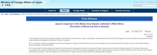 日本外務(wù)省關(guān)于向幾內(nèi)亞提供埃博拉檢測(cè)試劑盒的消息