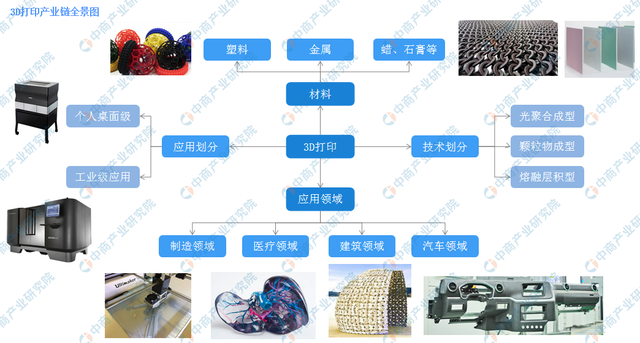 3D打印行業(yè)產(chǎn)業(yè)鏈從上中下游來看,上游為塑料、金屬、蠟、石膏、砂等其他各種材料。中游為3D打印設備及技術,下游則為制造、醫(yī)療、建筑、軍事等應用領域。