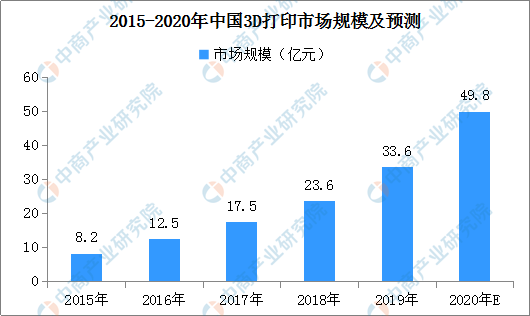 全球3D打印正火熱,由于中國引進3D打印技術較晚,與國外有一定差距,但近年來也得到快速發(fā)展。目前,中國的3D打印應用主要集中在家電及電子消費品、模具檢測、醫(yī)療及牙科正畸、航空航天等領域,未來將向醫(yī)療、建筑等更廣的應用場景發(fā)展。據(jù)數(shù)據(jù)顯示,2019年中國3D打印市場規(guī)模約為33.6億元。伴隨著中國3D打印技術的相應成熟,在航天航空,汽車等行業(yè)需求將持續(xù)增加,預計2020年中國3D打印市場規(guī)模將近50億元。