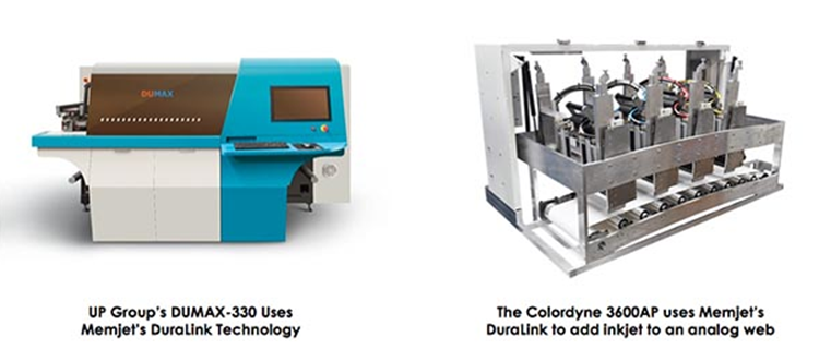 除Colordyne 3600系列外,這些打印機(jī)大多為小產(chǎn)能打印機(jī)。然而,與此同時,更大、更快的網(wǎng)絡(luò)開始出現(xiàn)。 Memjet就是這一轉(zhuǎn)變的領(lǐng)頭羊,其水性技術(shù)的新版本Duralink(2018)和DuraFlex(2019)符合大產(chǎn)能的要求。在Labelexpo上,至少三個OEM展示了基于一種或多種新"Dura"技術(shù)的原型:Astronova(DuraFlex), Colordyne(Duralink)和UP Group(Duralink)。