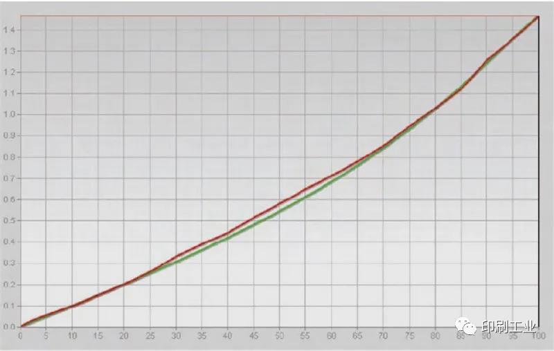 圖5 采用納米噴墨版印刷的NPDC曲線(紅),符合G7規(guī)范的NPDC曲線(綠)