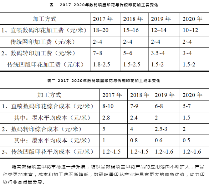 隨著數(shù)碼印花設(shè)備技術(shù)進(jìn)步、生產(chǎn)效率提升,以及墨水國(guó)產(chǎn)替代后的價(jià)格下降,使得我國(guó)數(shù)碼噴墨印花成本不斷下降,加工費(fèi)降低,相比傳統(tǒng)印花越發(fā)顯示出競(jìng)爭(zhēng)力。2017年以來,數(shù)碼噴墨印花與傳統(tǒng)印花的加工費(fèi)、加工成本變化情況如表一、表二所示。