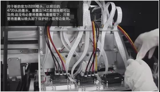 ⑧ 安裝墨囊于新的I3200噴頭,將之前置于一旁的墨囊按之前4720噴頭同樣的色序安裝。