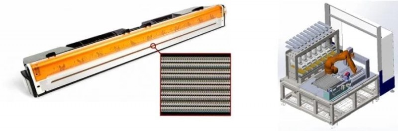 左:Duralink打印頭和1600 dpi下放大的5行噴嘴 右:DuraFlex全自動機(jī)器人裝配系統(tǒng)的一部分