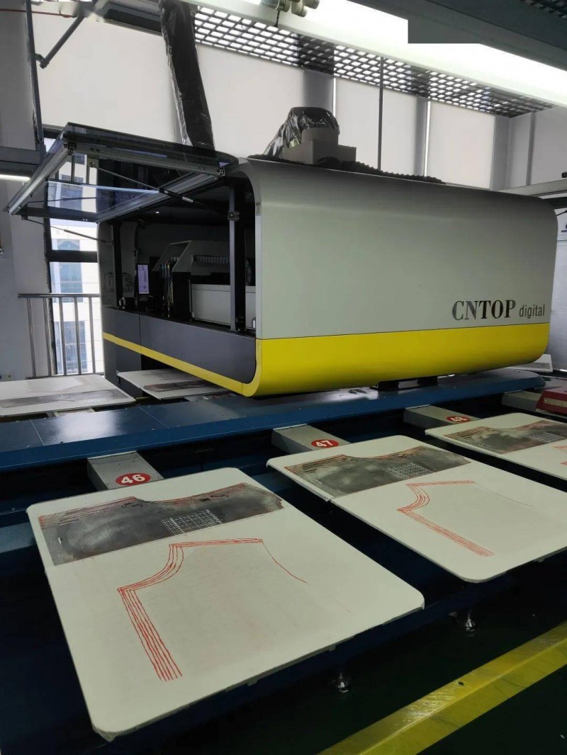 印花車間,工人們正在調(diào)試機器,準備棉服的印花生產(chǎn)。2個機械手臂自動放料收料,2臺誠拓數(shù)碼的橢圓機正在準備工作。隨著服裝快反的不斷發(fā)展,工廠已經(jīng)不需要大量的儲存空間,當季服飾當季生產(chǎn)。根據(jù)介紹,一臺誠拓的橢圓機能夠輕松做到一小時生產(chǎn)500余件。