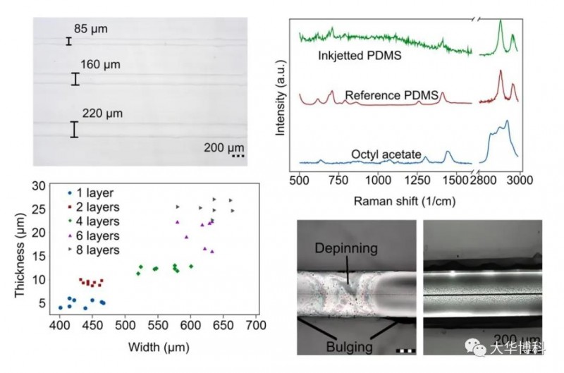 圖3|打印PDMS墨水線(xiàn)寬與多次打印形成的介電層厚度。