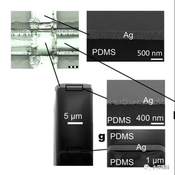 圖4|交叉位置疊層結(jié)構(gòu)。交叉位置形成了納米銀層--PDMS介電層