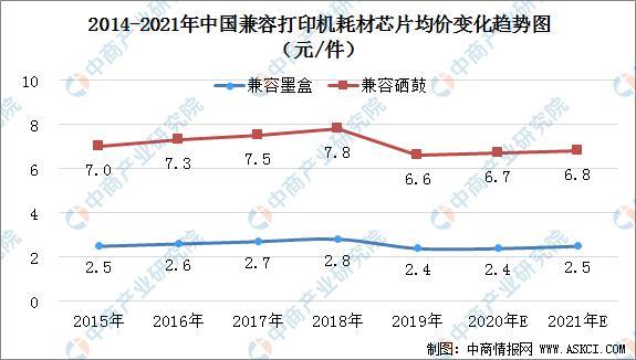 隨著兼容打印機耗材需求的不斷增加,2015年至2018年兼容打印機耗材芯片的平均價格也在逐漸增加。兼容硒鼓芯片的平均價格和兼容墨盒芯片的平均價格從每件7.0元和2.5元增至每件7.8元及2.8元,2015年至2018年複合年增長率分別為3.8%和3.7%。2019年,受中美貿易戰(zhàn)、新產(chǎn)品缺乏和產(chǎn)業(yè)整合的影響,兼容硒鼓芯片和兼容墨盒芯片的平均價格在2019年分別下降了14.8%和13.6%。在可預見的將來,隨著兼容打印機耗材需求的增長,兼容打印機耗材芯片的平均價格有望增長。預期2021年,兼容硒鼓芯片的平均價格和兼容墨盒的平均價格分別為每件6.8元和2.5元。