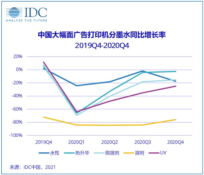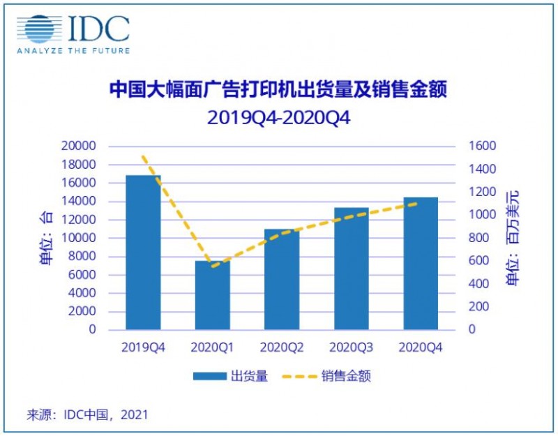 IDC《2020年第四季度工業(yè)打印機市場季度追蹤報告》顯示,2020年第四季度,中國大幅面廣告打印機出貨量超過1.4萬 臺,環(huán)比增長約8%,銷售金額超過11億元人民幣,環(huán)比增長約12%。設(shè)備出貨量與銷售金額均逐漸朝著疫情前水平持續(xù)穩(wěn)步恢復(fù)。