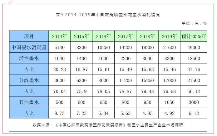 由表8可以看出,全球數(shù)碼噴墨印花墨水的消耗量逐年增加,2019年達(dá)到5.75萬噸,五年來翻了近兩倍,其中活性墨水占比約20%,分散墨水占比約60%,酸性、涂料等其他墨水占比約20%。數(shù)碼噴墨印花墨水消耗量的變化反映了數(shù)碼噴墨印花技術(shù)的發(fā)展勢(shì)頭和前景。預(yù)計(jì)到2025年全球數(shù)碼噴墨印花墨水的消耗量將達(dá)到16萬噸。