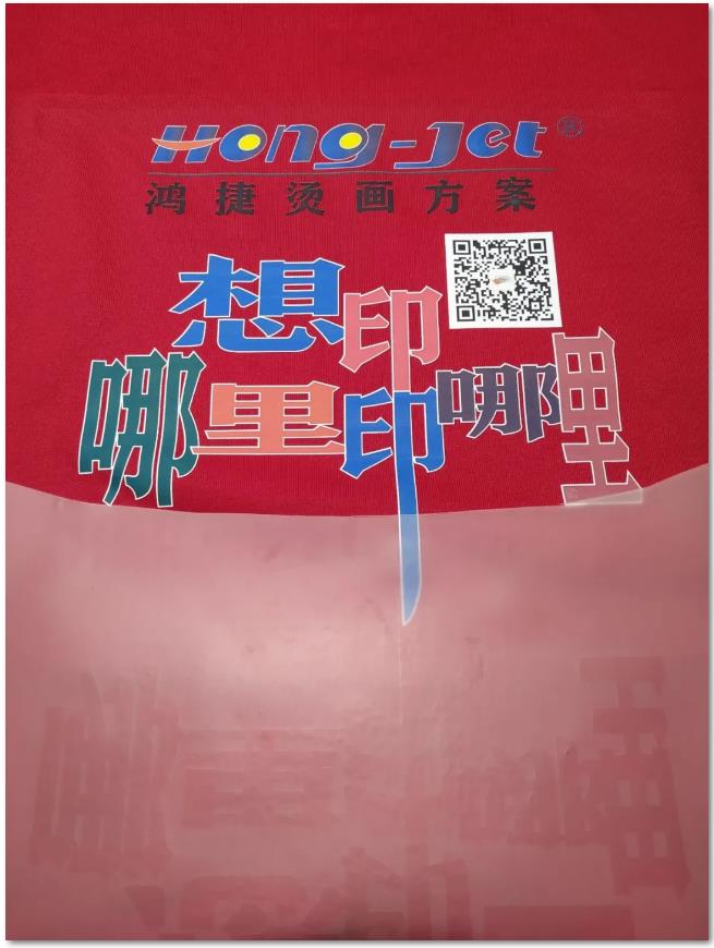 上圖:大紅色衛(wèi)衣采用DTF膜轉印,正在撕膜