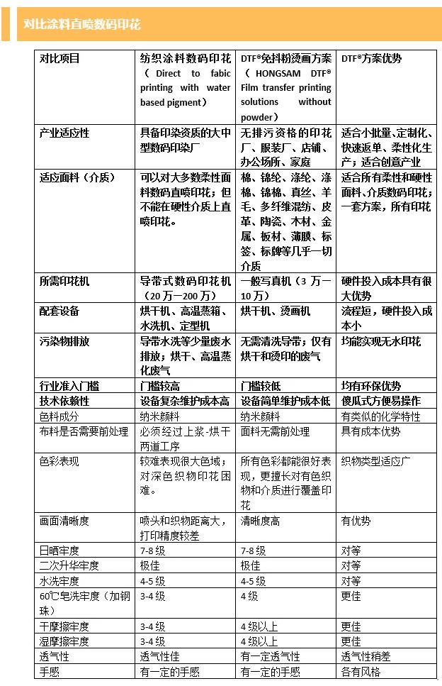 下面根據(jù)已有資料和行業(yè)認知,將該方案和熱轉印、抖粉燙畫、涂料印花、弱溶劑等數(shù)碼印花方案做了對比。僅代表部分意見,雖然未必全面和科學,希望窺斑見豹、拋磚引玉。