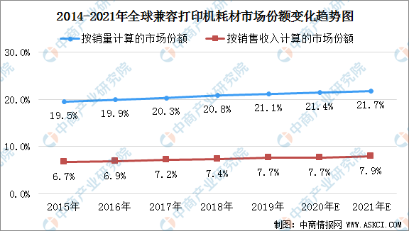 預(yù)計(jì)到2021年,全球兼容打印機(jī)耗材市場(chǎng)中,兼容墨盒市場(chǎng)規(guī)模將超70億元,兼容硒鼓市場(chǎng)規(guī)模達(dá)39.43億元。
